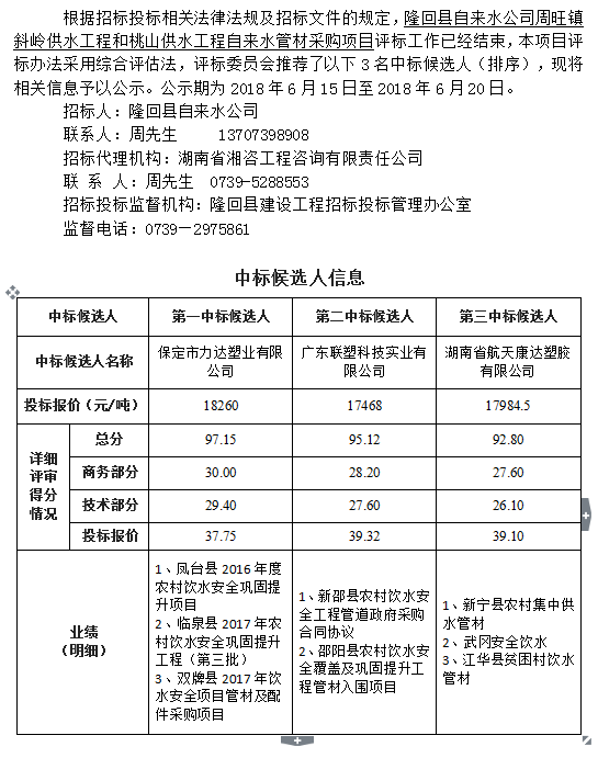 隆回縣自來水公司周旺鎮(zhèn)斜嶺供水工程和桃山供水工程自來水管材采購項(xiàng)目招標(biāo)投標(biāo)信息公示表
