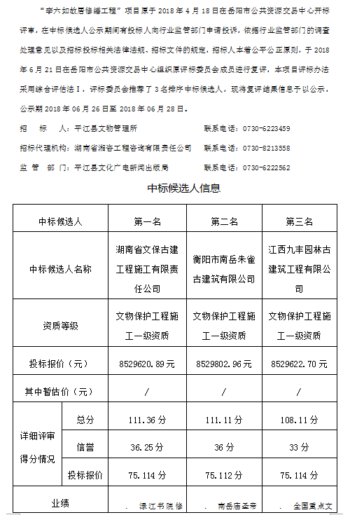 李六如故居修繕工程項目中標候選人復評公示