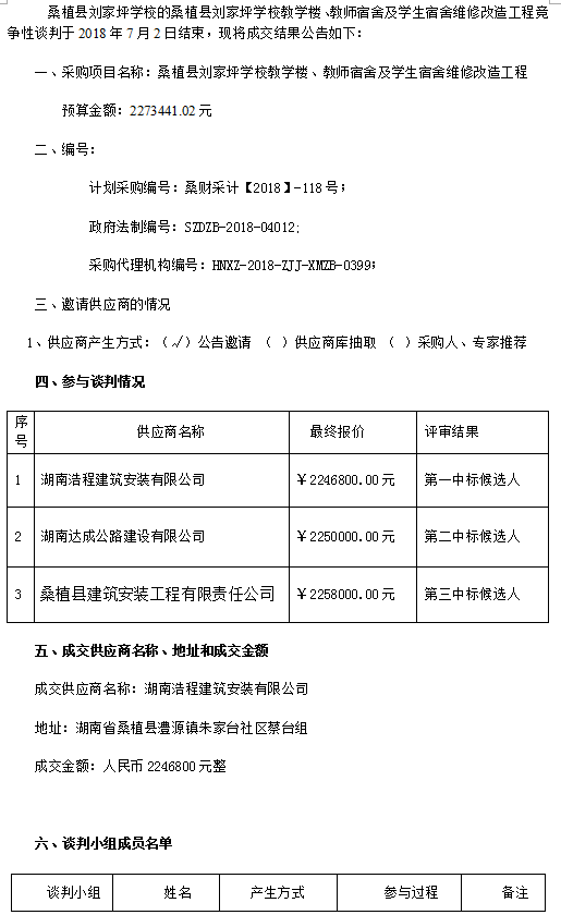 桑植縣劉家坪學(xué)校教學(xué)樓、教師宿舍及學(xué)生宿舍維修改造工程競爭性談判成交結(jié)果公告
