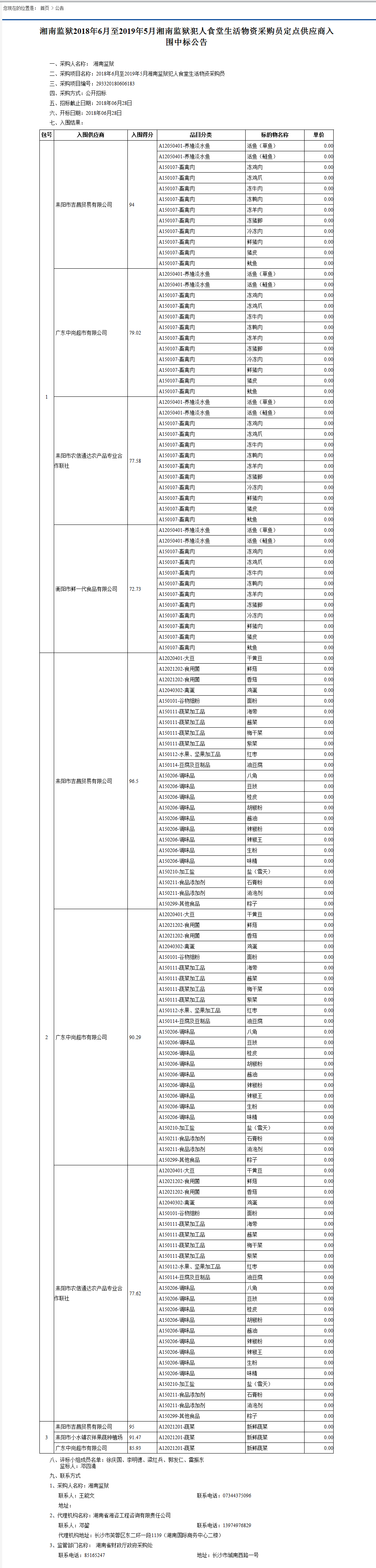 湘南監(jiān)獄2018年6月至2019年5月湘南監(jiān)獄犯人食堂生活物資采購員定點(diǎn)供應(yīng)商入圍中標(biāo)公告