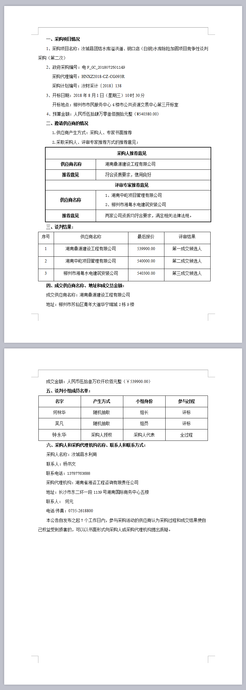 汝城縣團(tuán)結(jié)水庫溢洪道、鋼口店(白鋼)水庫除險(xiǎn)加固項(xiàng)目競爭性談判采購(第二次)成交公告