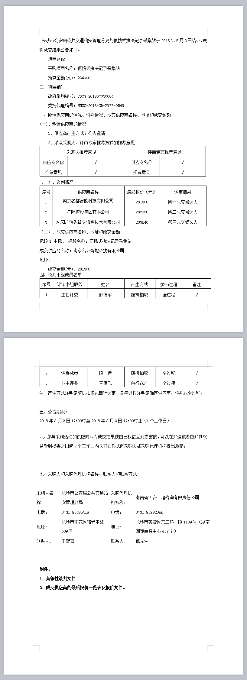 長(zhǎng)沙市公安局公共交通治安管理分局便攜式執(zhí)法記錄采集站結(jié)果公告