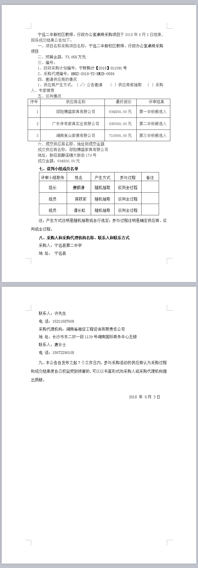 寧遠(yuǎn)二中新校區(qū)教師、行政辦公室桌椅采購(gòu)項(xiàng)目競(jìng)爭(zhēng)性談判成交結(jié)果公告