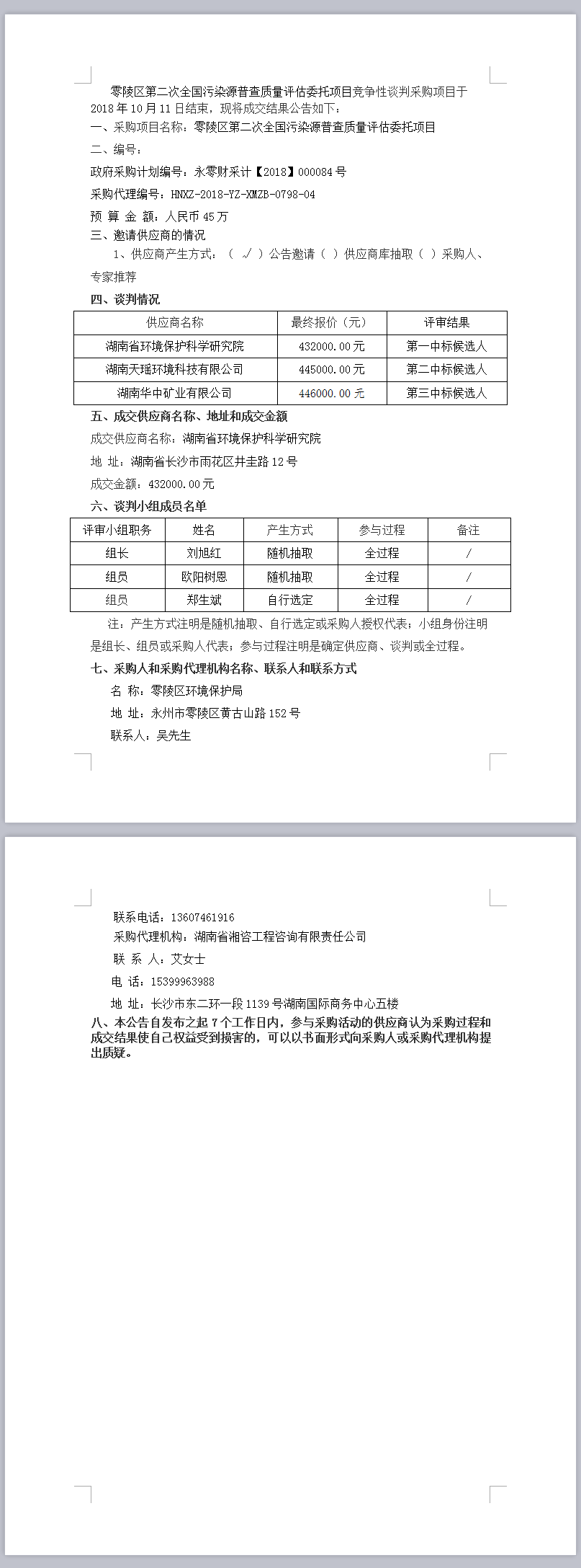 零陵區(qū)第二次全國污染源普查質(zhì)量評估委托項目競爭性談判成交公告