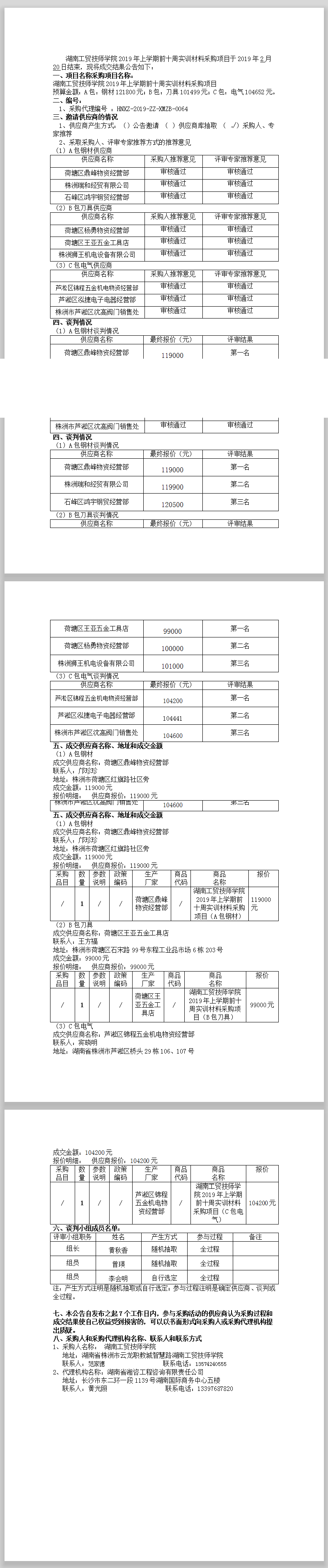湖南工貿(mào)技師學院2019年上學期前十周實訓材料采購項目競爭性談判成交公告
