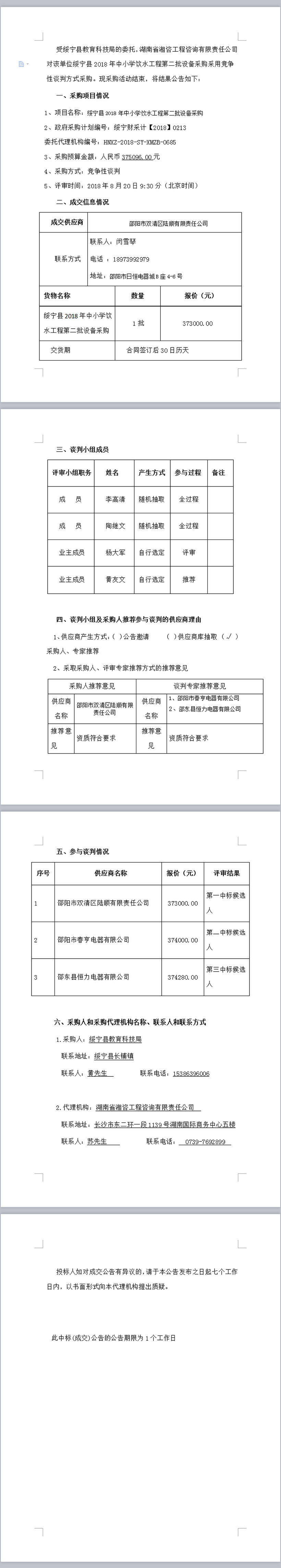 綏寧縣2018年中小學飲水工程第二批設備采購談判成交公告