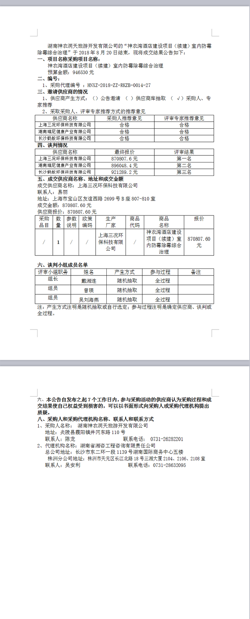 神農(nóng)灣酒店建設(shè)項(xiàng)目(續(xù)建)室內(nèi)防霉除霉綜合治理競(jìng)爭(zhēng)性談判成交公告