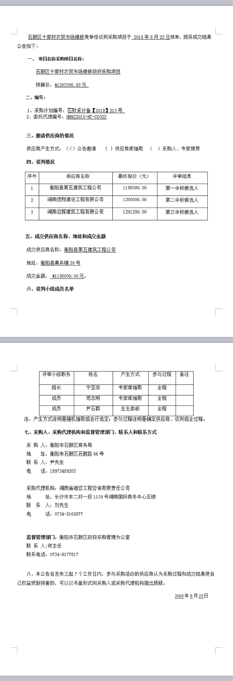 石鼓區(qū)十家村農(nóng)貿(mào)市場維修政府采購項(xiàng)目 競爭性談判成交結(jié)果公告