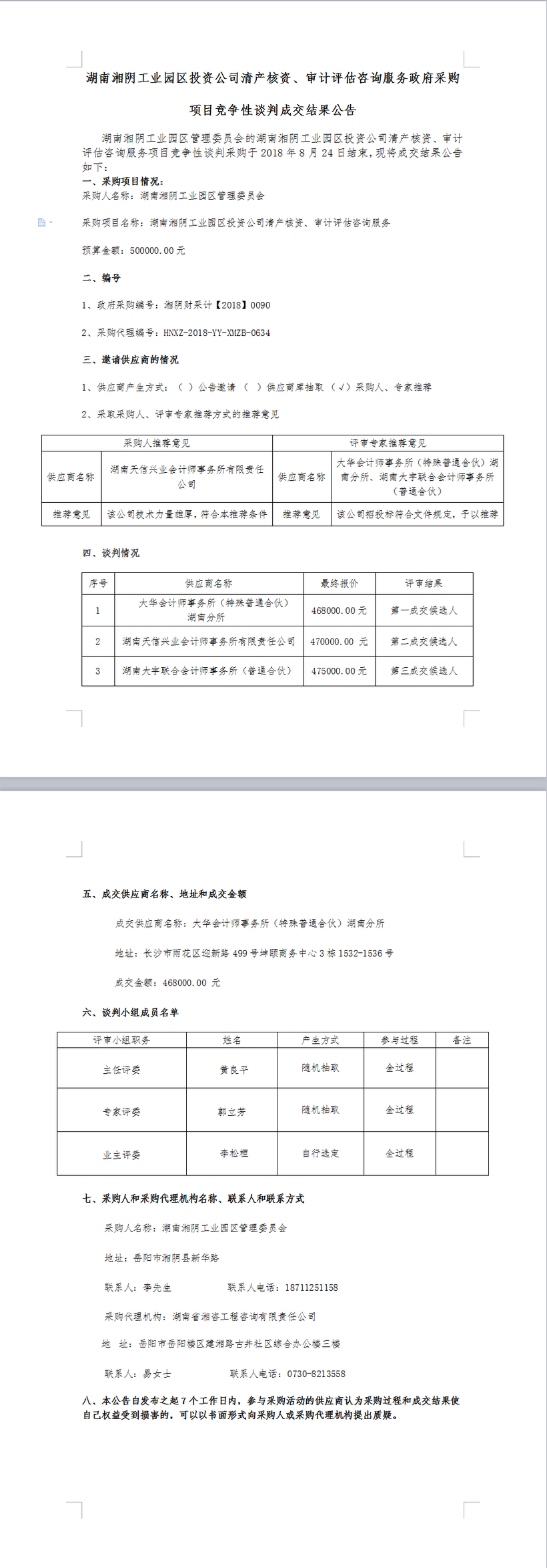 湖南湘陰工業(yè)園區(qū)投資公司清產(chǎn)核資、審計評估咨詢服務(wù)政府采購 項目競爭性談判成交結(jié)果公告
