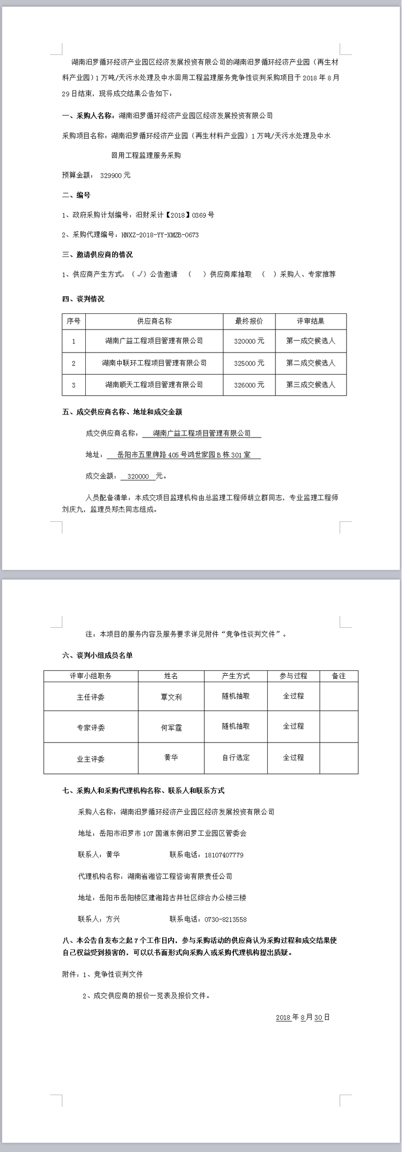 湖南汨羅循環(huán)經(jīng)濟(jì)產(chǎn)業(yè)園(再生材料產(chǎn)業(yè)園)1萬噸/天污水處理及中水回用工程監(jiān)理服務(wù)政府采購(gòu)項(xiàng)目競(jìng)爭(zhēng)性談判成交結(jié)果公告