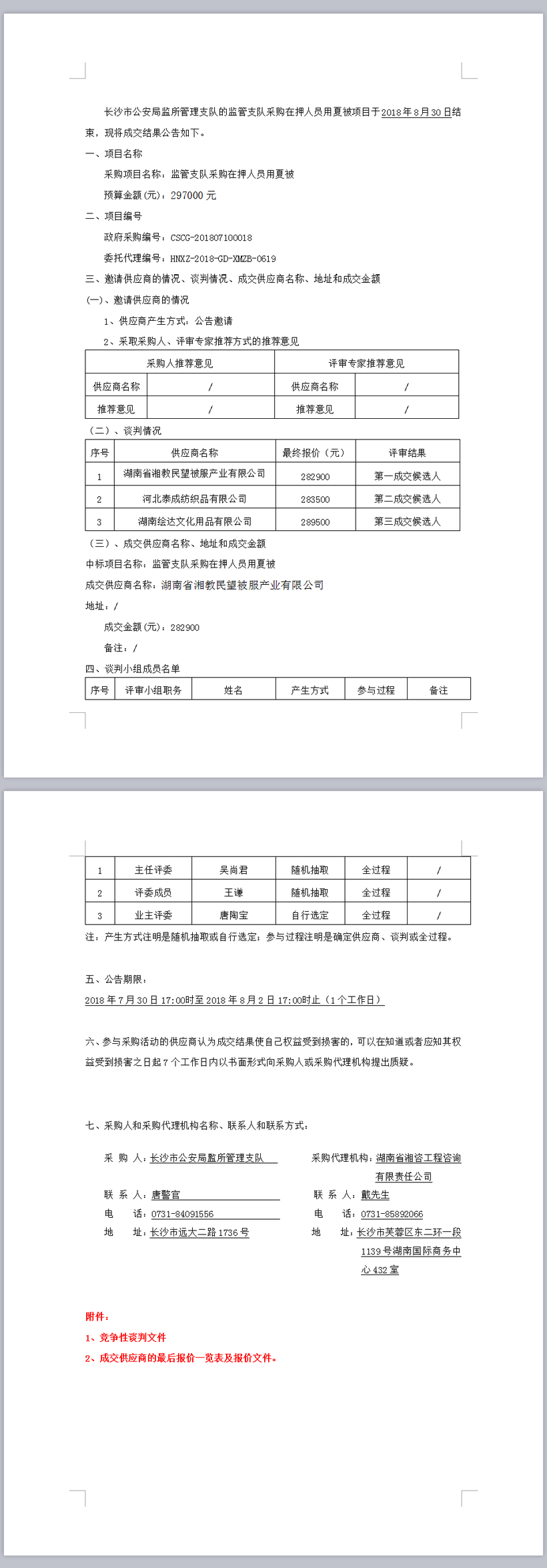 監(jiān)管支隊采購在押人員用夏被結(jié)果公告