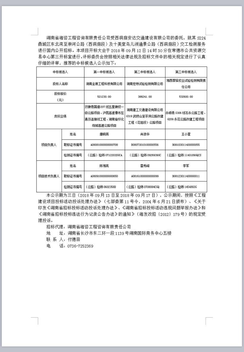 S224鼎城區(qū)東北灣至崇河公路(西洞庭段)及十美堂鳥兒洲通景公路(西洞庭段)交工檢測服務中標候選人公示