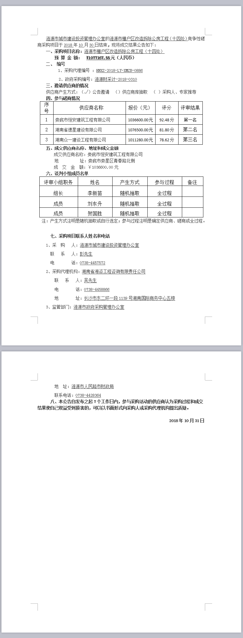 漣源市棚戶區(qū)改造拆除公房工程(十四處) 競爭性磋商成交結(jié)果公告