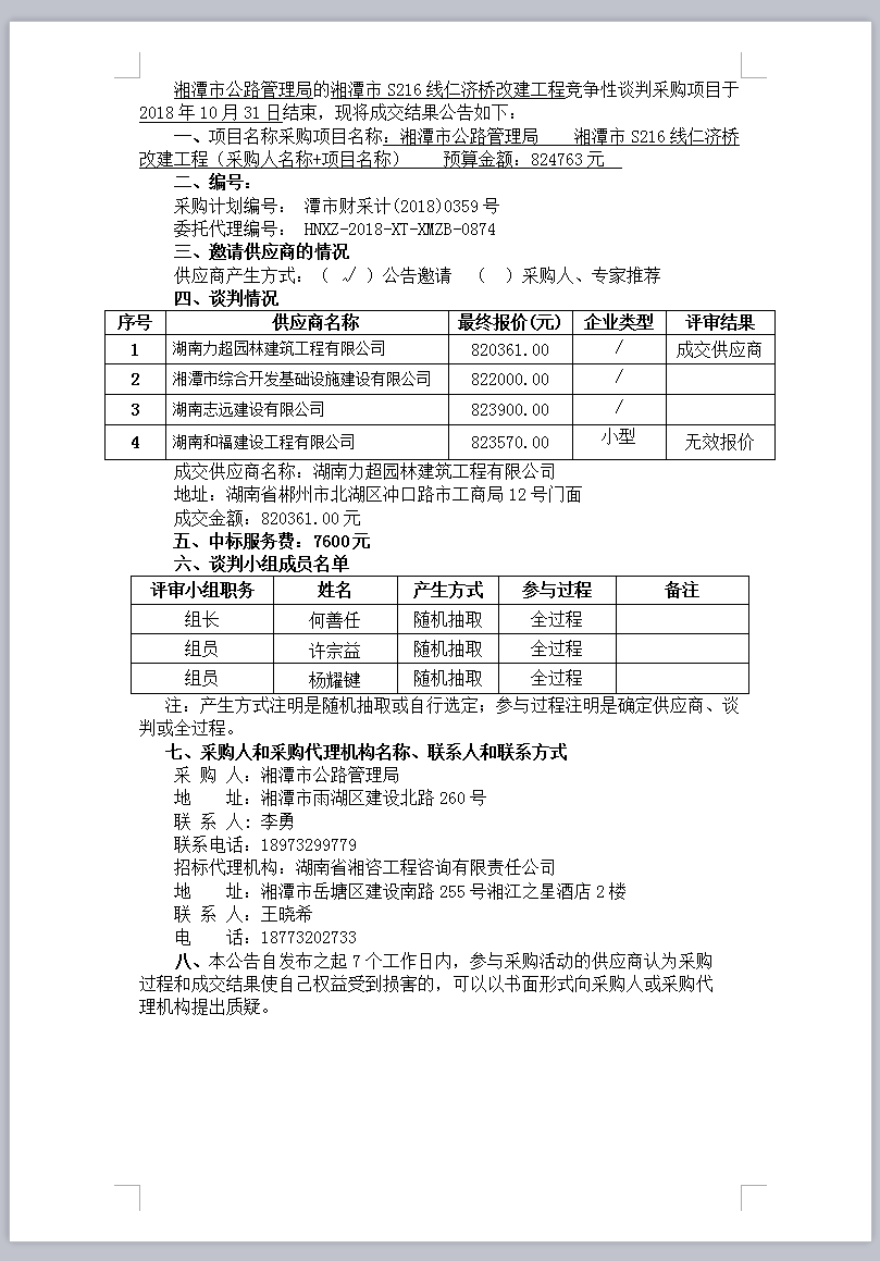 湘潭市S216線仁濟(jì)橋改建工程競爭性談判成交結(jié)果公告