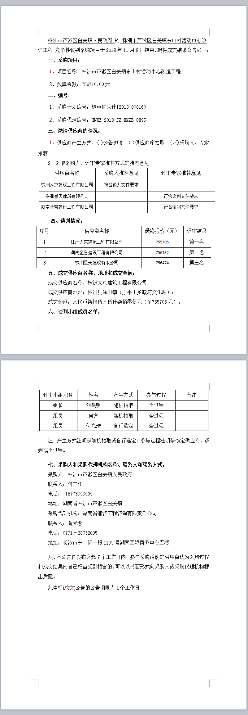 株洲市蘆淞區(qū)白關(guān)鎮(zhèn)東山村活動(dòng)中心改造工程談判成交公告