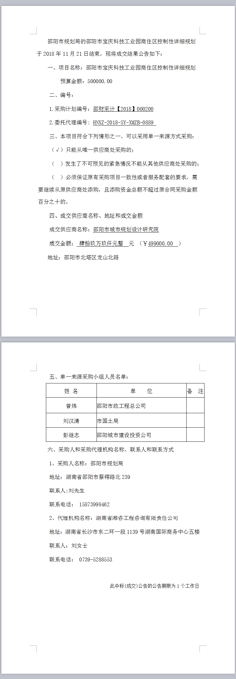 邵陽市寶慶科技工業(yè)園商住區(qū)控制性詳細(xì)規(guī)劃采購項目單一來源成交公告