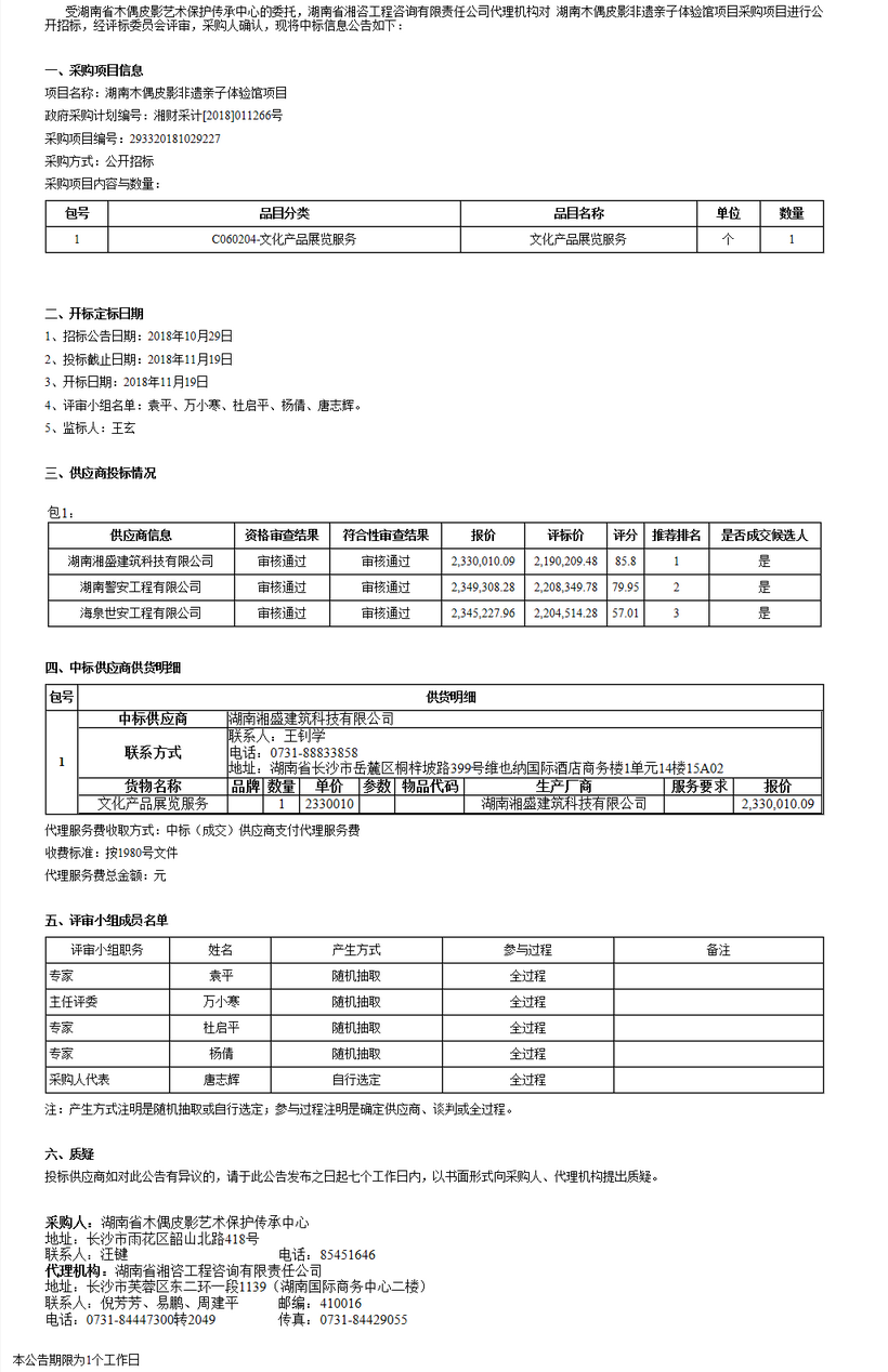 湖南省木偶皮影藝術保護傳承中心湖南木偶皮影非遺親子體驗館公開招標中標公告