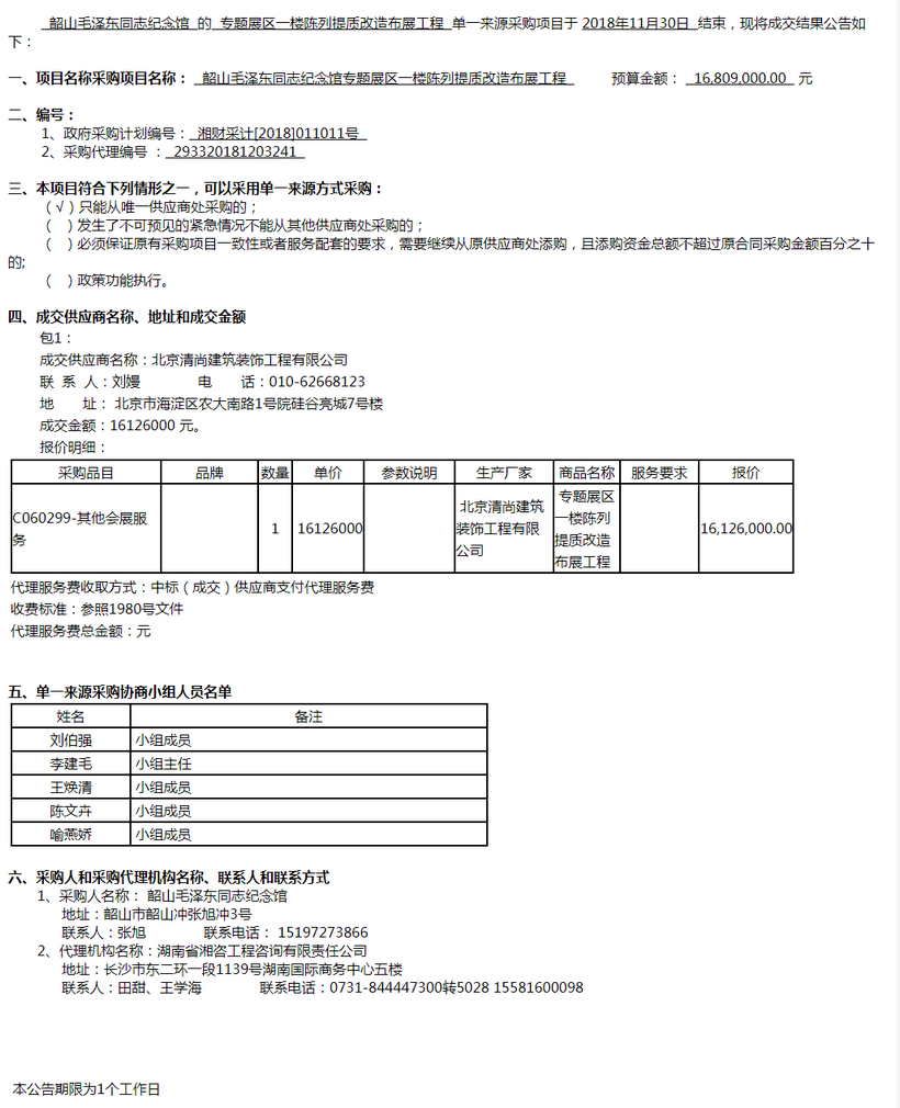 韶山毛澤東同志紀念館專題展區(qū)一樓陳列提質改造布展工程單一來源采購成交公告