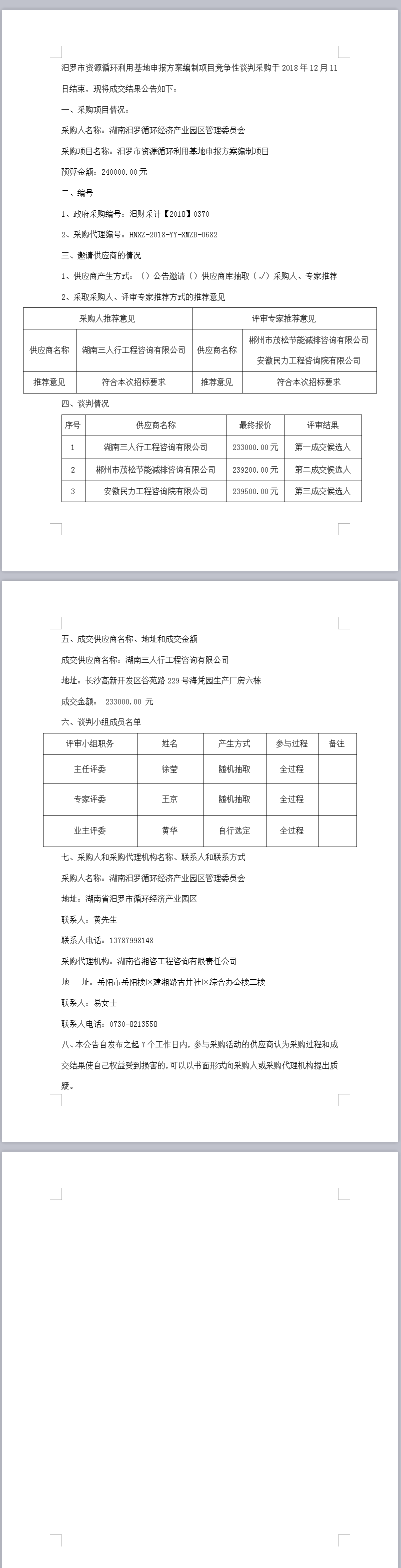 湖南汨羅循環(huán)經(jīng)濟(jì)產(chǎn)業(yè)園區(qū)管理委員會(huì)競爭性談判成交結(jié)果公告