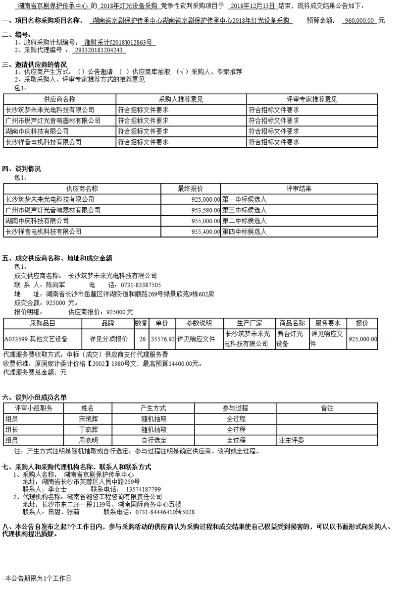 湖南省京劇保護傳承中心2018年燈光設(shè)備采購 競爭性談判成交公告