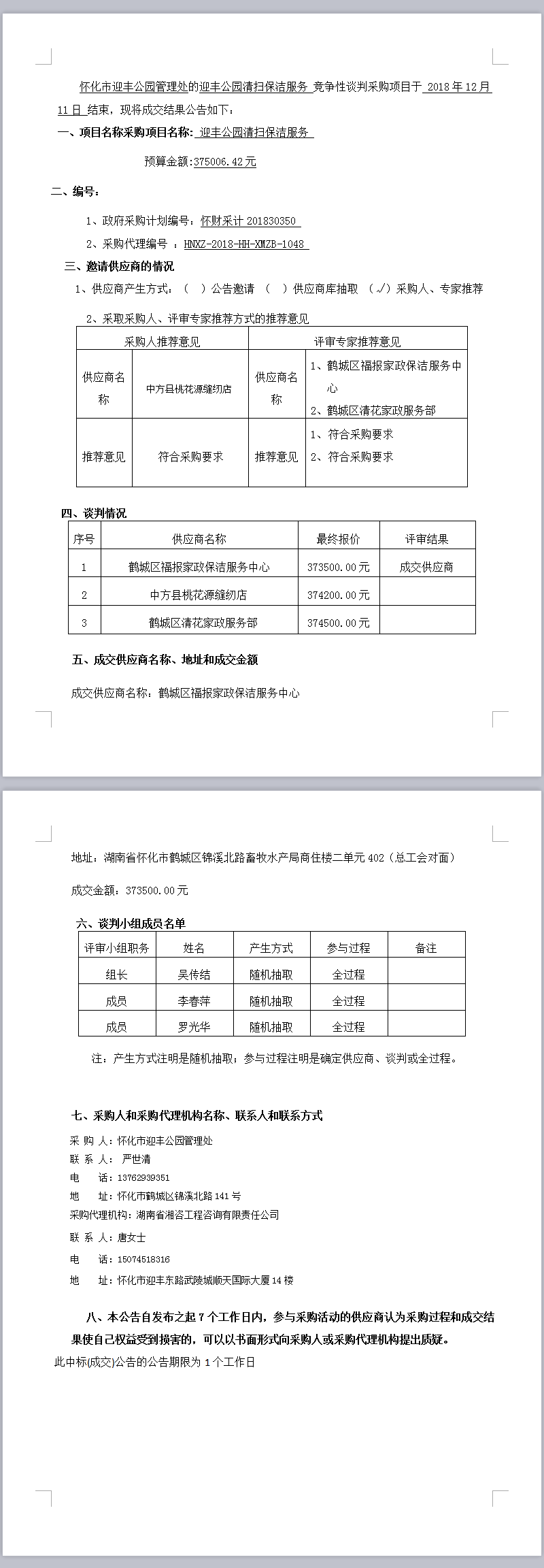 迎豐公園清掃保潔服務(wù)談判成交公告