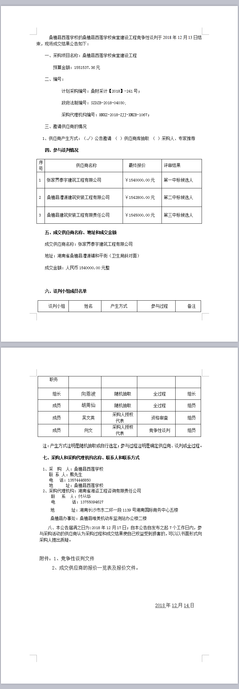 桑植縣西蓮學(xué)校食堂建設(shè)工程競爭性談判成交結(jié)果公告