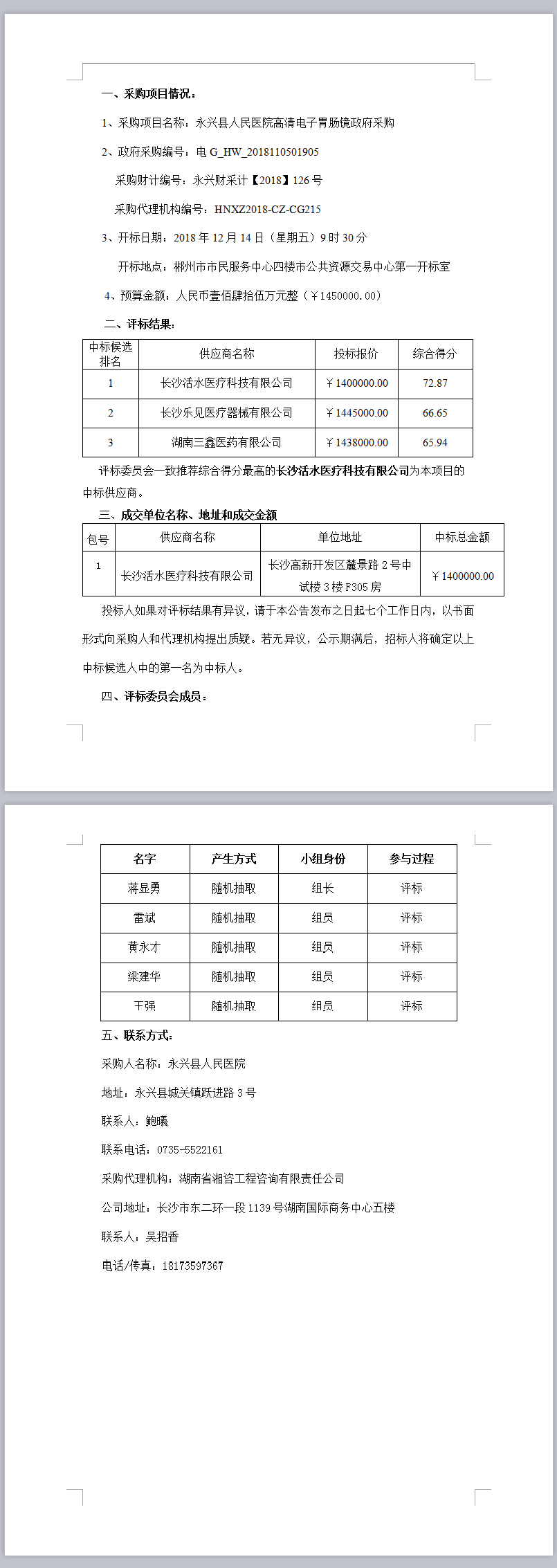 永興縣人民醫(yī)院高清電子胃腸鏡政府采購中標結(jié)果公示