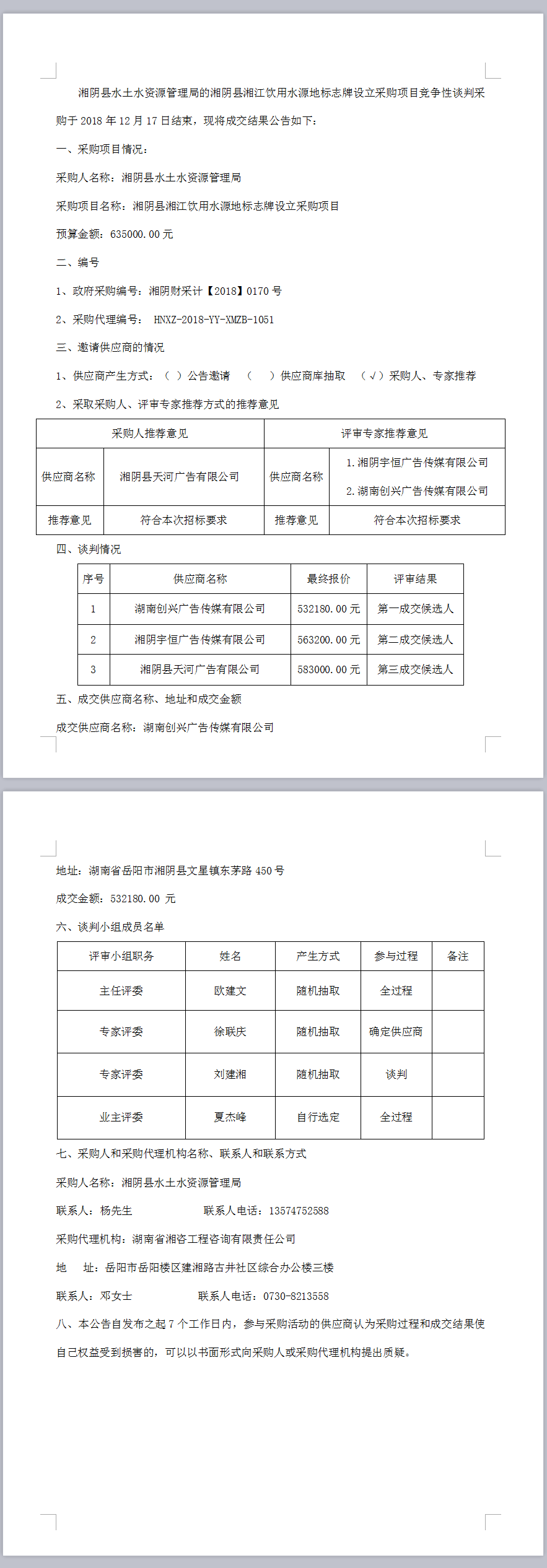 湘陰縣湘江飲用水源地標(biāo)志牌設(shè)立采購項(xiàng)目 競爭性談判成交結(jié)果公告