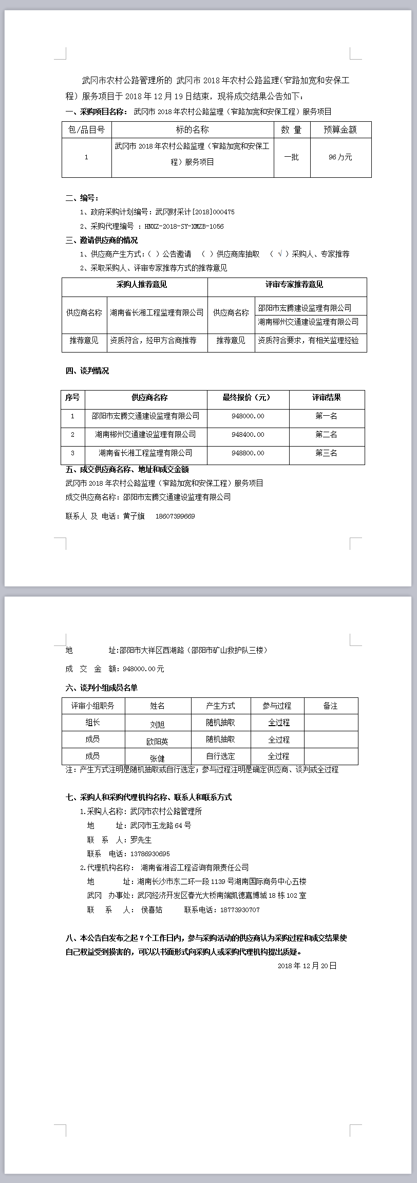 武岡市2018年農(nóng)村公路監(jiān)理(窄路加寬和安保工程)服務(wù)項(xiàng)目采購 競(jìng)爭(zhēng)性談判成交結(jié)果公告
