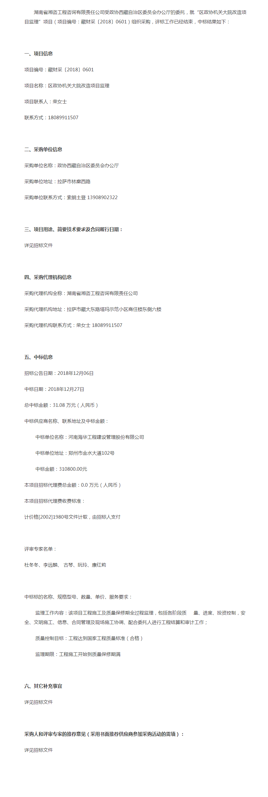 政協(xié)西藏自治區(qū)委員會辦公廳區(qū)政協(xié)機關(guān)大院改造項目監(jiān)理中標(biāo)公告