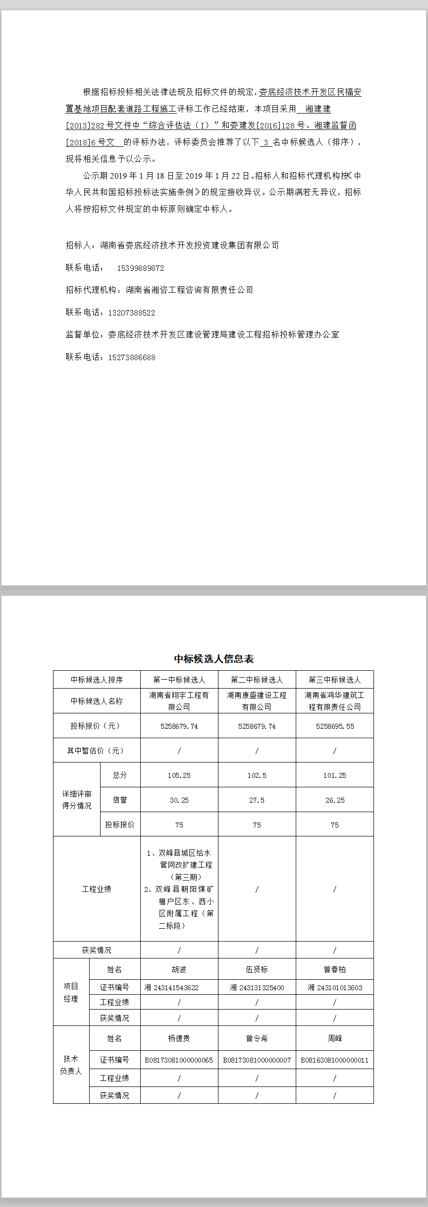 婁底經(jīng)濟技術(shù)開發(fā)區(qū)民福安置基地項目配套道路工程施工中標候選人公示