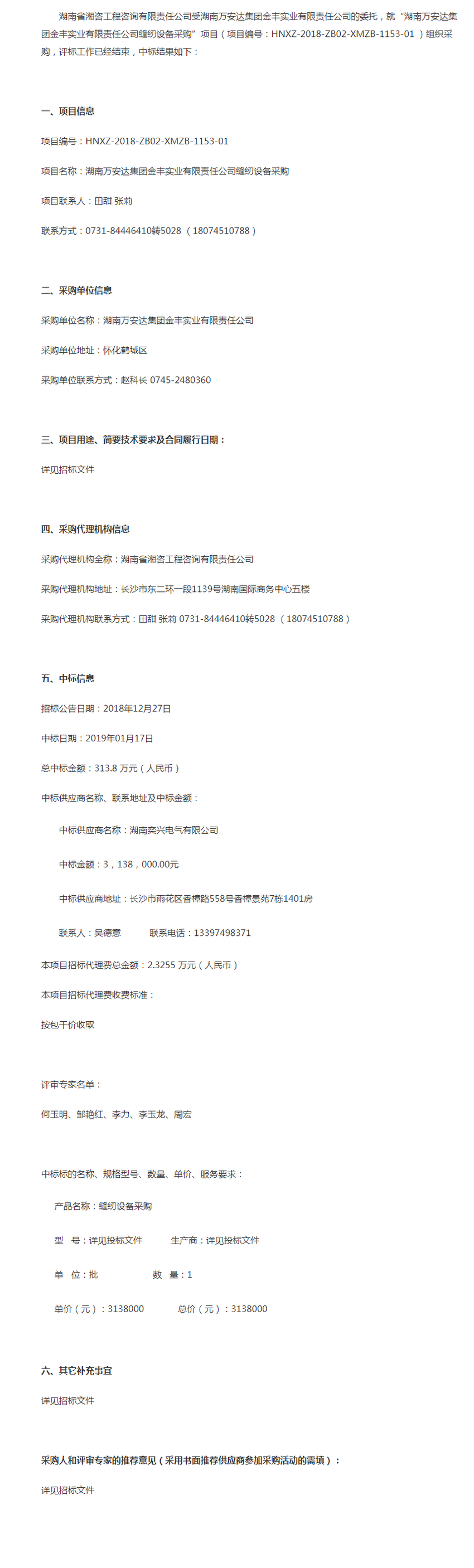 湖南萬安達(dá)集團(tuán)金豐實(shí)業(yè)有限責(zé)任公司縫紉設(shè)備采購中標(biāo)結(jié)果公示