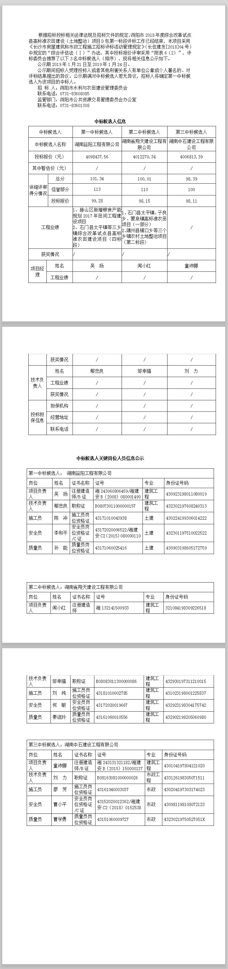 瀏陽市2018年度綜合改革試點縣高標準農(nóng)田建設(shè)(土地整治)項目D包第一標段 中標候選人公示