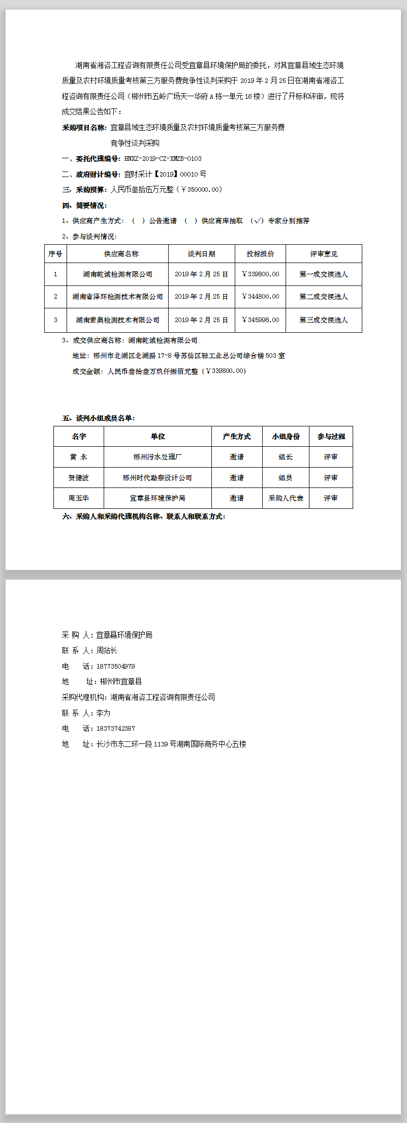宜章縣域生態(tài)環(huán)境質(zhì)量及農(nóng)村環(huán)境質(zhì)量考核第三方服務(wù)費(fèi)競(jìng)爭(zhēng)性談判采購(gòu)成交公告