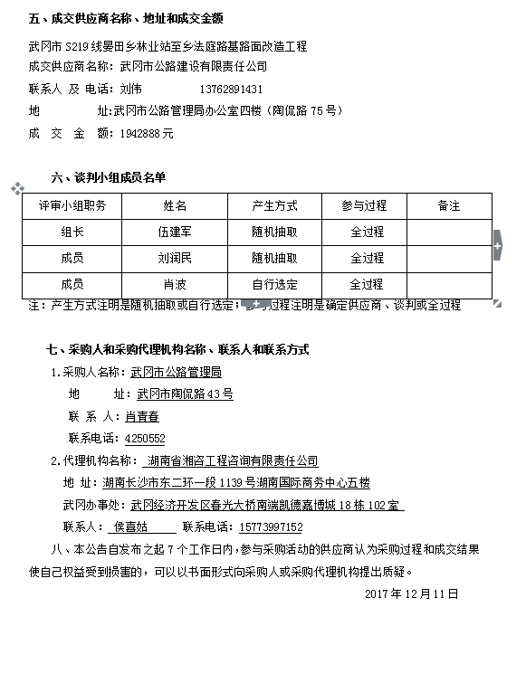 武岡市S219線晏田鄉(xiāng)林業(yè)站至鄉(xiāng)法庭路基路面改造工程競爭性談判成交結(jié)果公告