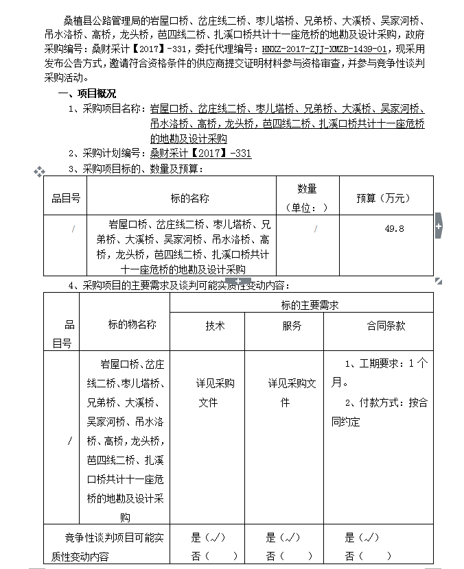 巖屋口橋、岔莊線二橋、棗兒塔橋、兄弟橋、大溪橋、吳家河橋、吊水洛橋、高橋,龍頭橋,芭四線二橋、扎溪口橋共計(jì)十一座危橋的地勘及設(shè)計(jì)采購(gòu) 談判公告