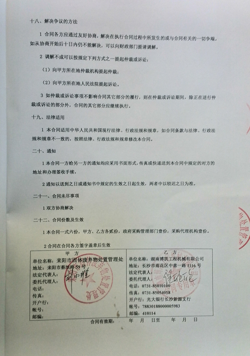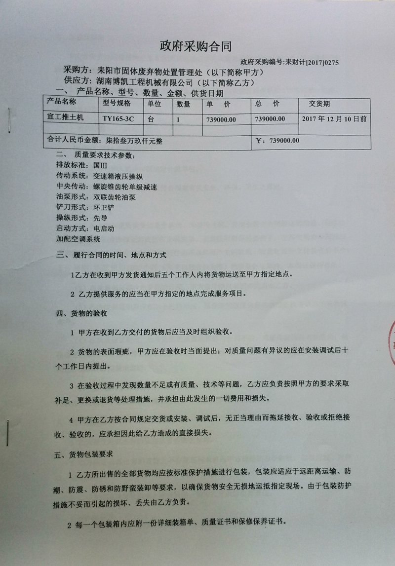 耒陽市固體廢棄物處置管理處推土機(環(huán)衛(wèi)型)合同公示