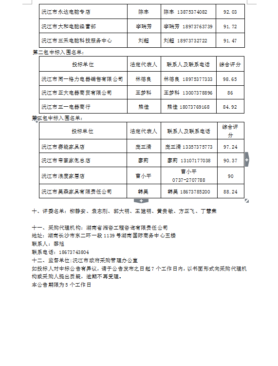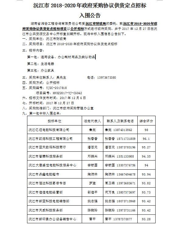 沅江市2018-2020年政府采購協(xié)議供貨定點招標 入圍公告