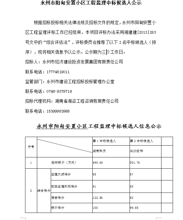 永州市陽甸安置小區(qū)工程監(jiān)理中標候選人公示