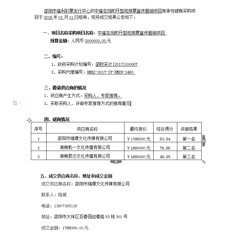 中福在線即開型視頻票宣傳營銷項目 競爭性磋商成交公告