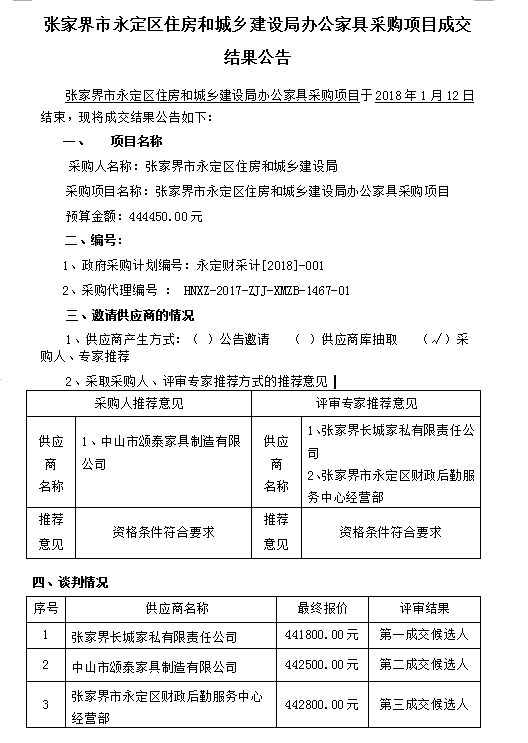 張家界市永定區(qū)住房和城鄉(xiāng)建設(shè)局辦公家具采購項(xiàng)目成交結(jié)果公告