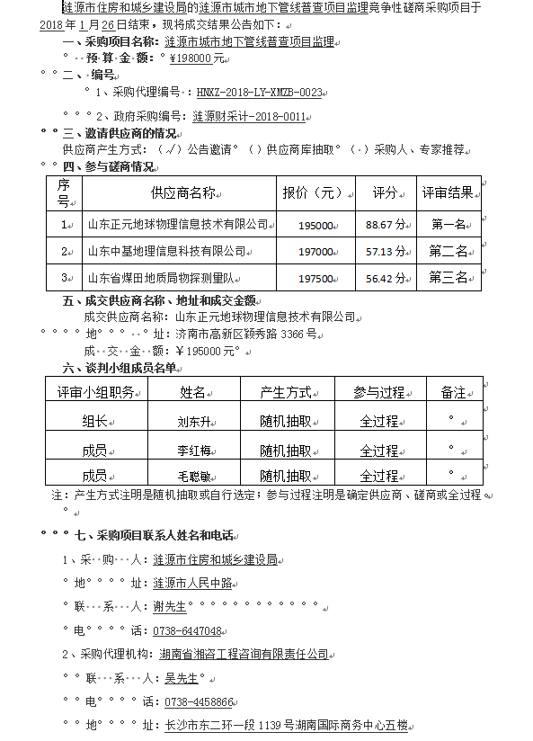 漣源市城市地下管線普查項目監(jiān)理競爭性磋商 成交結(jié)果公告