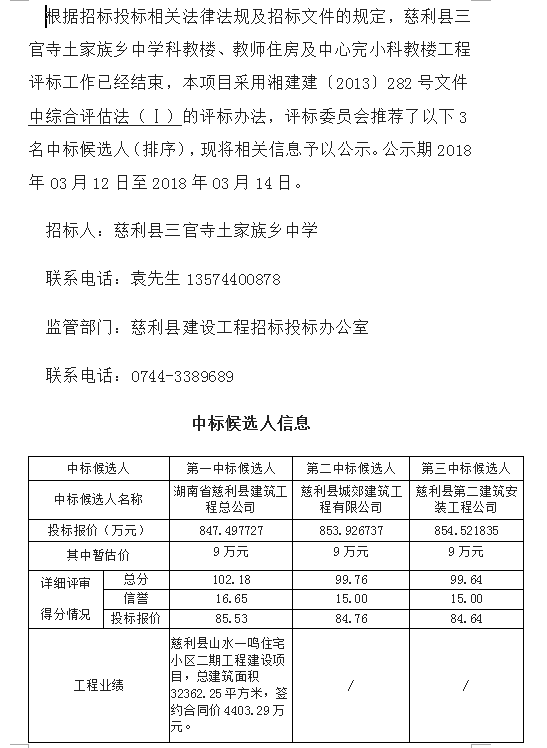 慈利縣三官寺土家族鄉(xiāng)中學(xué)科教樓、教師住房及中心完小科教樓工程施工招標(biāo) 投標(biāo)信息公示表