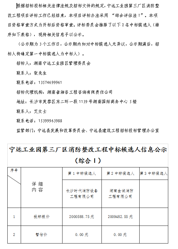 寧遠(yuǎn)工業(yè)園第三廠區(qū)消防整改工程 中標(biāo)候選人公示