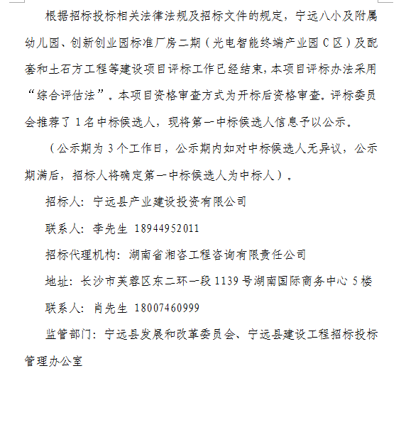 寧遠(yuǎn)八小及附屬幼兒園、創(chuàng)新創(chuàng)業(yè)園標(biāo)準(zhǔn)廠房二期(光電智能終端產(chǎn)業(yè)園C區(qū))及配套和土石方工程等建設(shè)項目中標(biāo)候選人信息公示