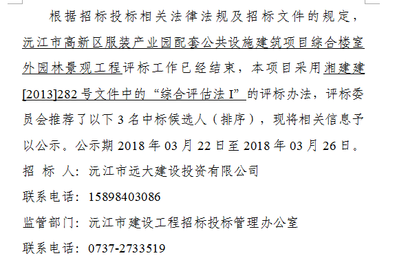 沅江市高新區(qū)服裝產(chǎn)業(yè)園配套公共設施建筑項目綜合樓室外園林景觀工程中標候選人公示