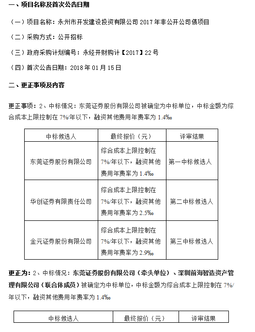 永州市開發(fā)建設(shè)投資有限公司2017年非公開公司債項(xiàng)目中標(biāo)公告更正公告