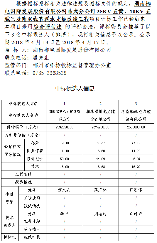 湖南郴電國際發(fā)展股份有限公司臨武分公司35KV五黃、10KV五城三及南雙線官溪水支線改造工程 中標候選人公示