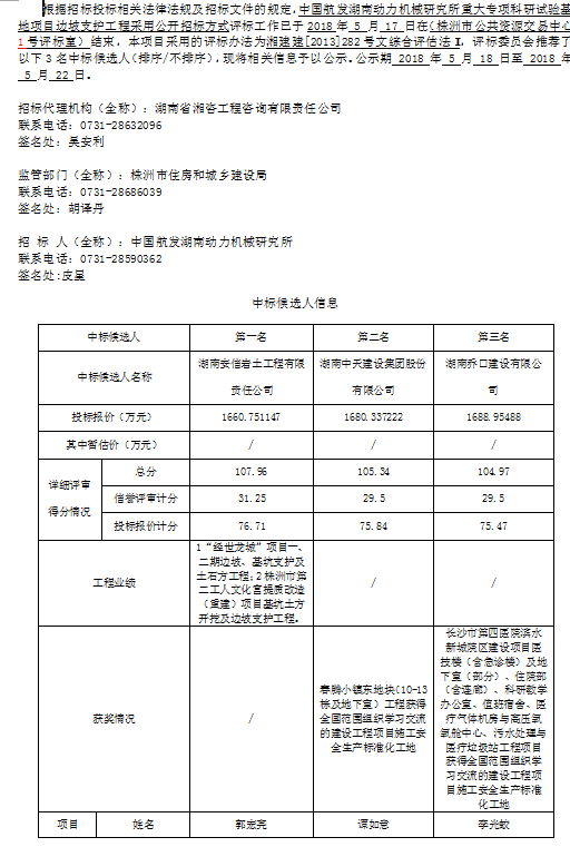 中國航發(fā)湖南動力機械研究所重大專項科研試驗基地項目邊坡支護工程招標投標信息公示表
