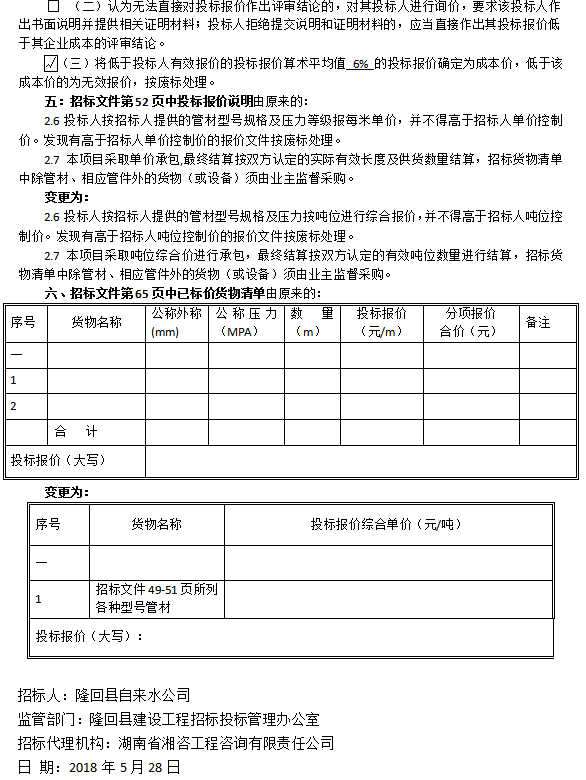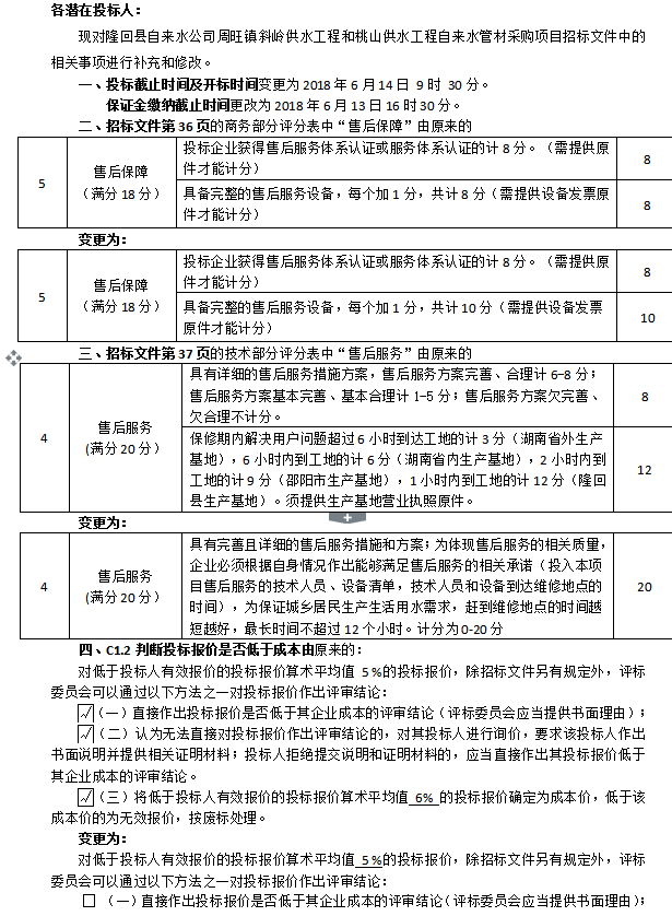 隆回縣自來水公司周旺鎮(zhèn)斜嶺供水工程和桃山供水工程 自來水管材采購(gòu)項(xiàng)目招標(biāo)文件修改及延期公告